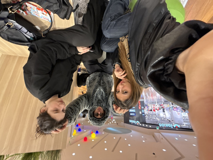 Three young people pose for a selfie, seemingly at a shopping mall. The first person wears a black puffer jacket and dark pants, seated beside a black bag. The second is wearing a gray hooded jacket and dark sunglasses. The third individual dons a black leather jacket and jeans. In the background, a store sign for "Idkids" is visible, along with white flooring accented by colorful light fixtures. The overall image is rotated, presenting an upside-down view.