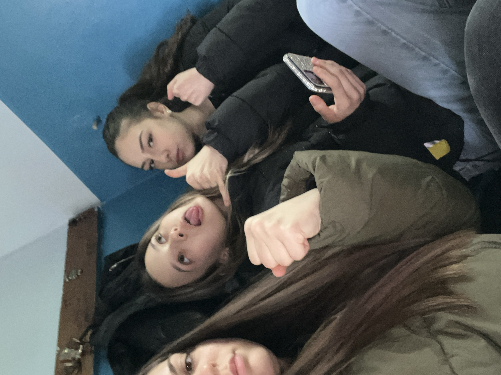This image captures three young females indoors in Cherven Bryag, Bulgaria. The background features a plain blue painted wall on the right and a sloped, lighter-colored ceiling section on the upper left. A dark wooden plank or shelf with several indistinct small objects is mounted on the wall in the upper left background. A black garment is partially visible draped behind the central figure. From left to right: 1. The leftmost female's right profile is partially visible, showing her right eye, cheek, and a portion of her jawline. She has long, dark brown hair and wears an olive-green puffer jacket. Her right hand is clenched into a fist, positioned in the lower-middle foreground. 2. The central female is looking upwards and to the right, with her eyes wide and her tongue extended from her mouth in a playful manner. Her right hand is making a 'shaka' gesture (thumb and pinky extended). She wears a black puffer jacket and has long, dark brown hair. 3. The rightmost female, positioned against the blue wall, has dark brown hair pulled back into a ponytail. She wears a black puffer jacket and light blue jeans. Her right hand holds a silver-colored smartphone with a textured or bejeweled case, while her left hand is clenched into a fist at chest height. Her facial expression is relatively neutral, with slightly pursed lips. The scene depicts a casual, candid moment within an interior setting.