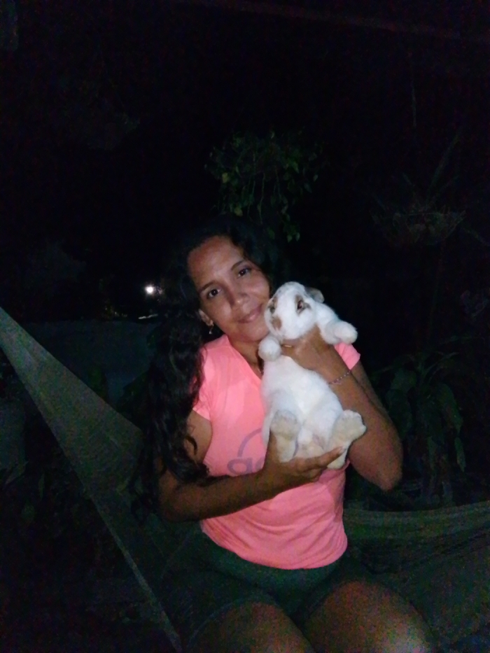- "The image depicts an adult female holding a rabbit in an outdoor or semi-outdoor nighttime setting in Juan Griego, Venezuela" by FM-5rRTy1, licensed under CC BY 4.0