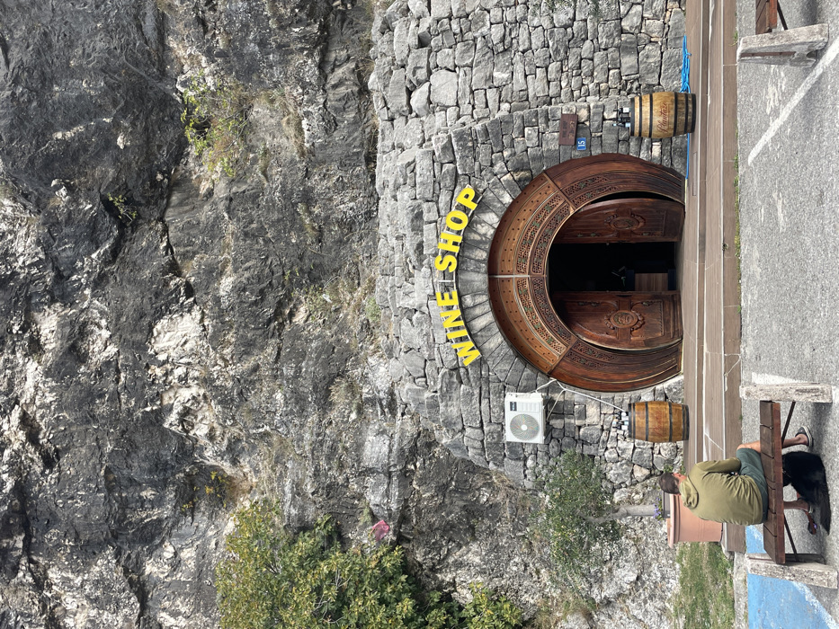 An image taken in Vranjina, Montenegro, depicts a "WINE SHOP" entrance built into the base of a large, dark, rocky cliff face