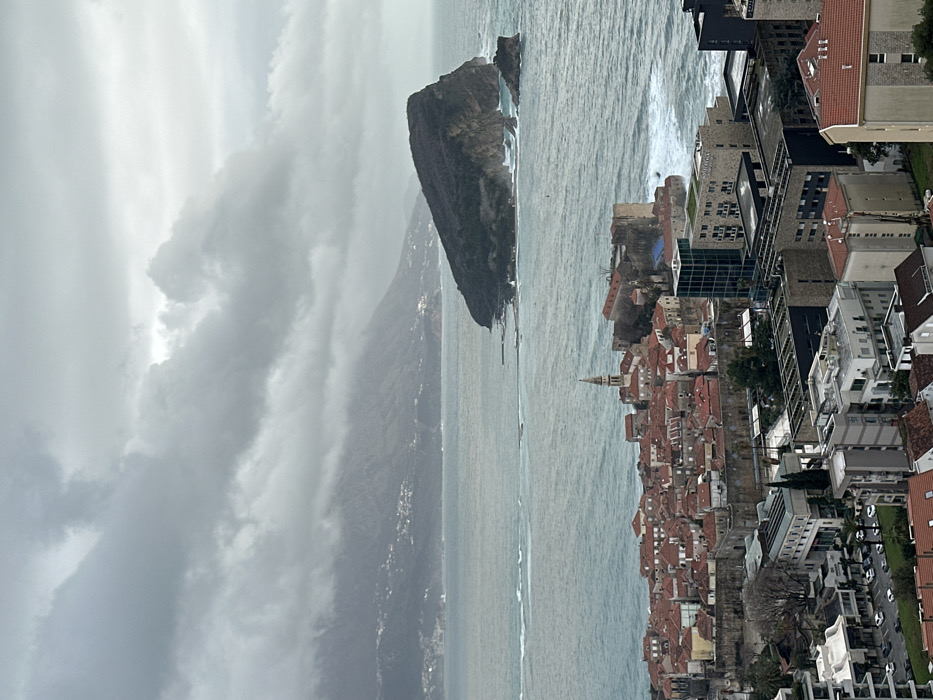 This image presents a high-angle, panoramic view of the coastal city of Budva, Montenegro, under an overcast sky