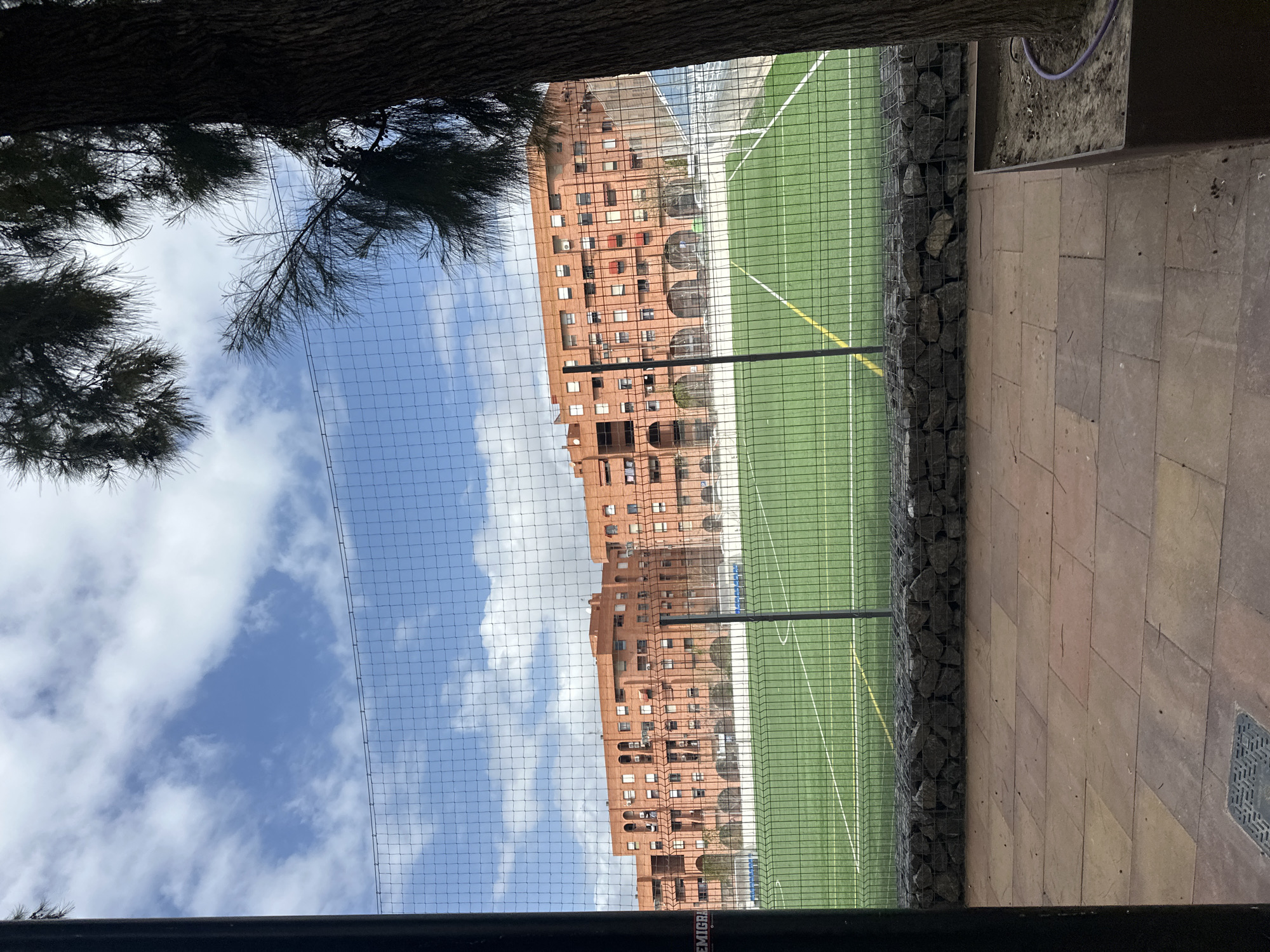 The image displays an outdoor scene in Alicante, Spain, focused on a synthetic turf sports field with residential buildings in the background. In the immediate foreground, a paved patio of reddish-brown rectangular flagstones is visible, along with a dark vertical post on the left featuring a partial "EMIGRA" sticker, and the trunk and dark branches of a large tree on the right, accompanied by a dark metal planter containing a purple hose. A dark mesh fence, supported by metal posts, stretches horizontally across the middle ground, separating the patio from the sports field. Beneath the fence is a gabion wall constructed from stones contained within wire mesh. The synthetic turf sports field beyond the fence is green and marked with white lines (indicating a football/soccer pitch) and a single yellow line. A white goalpost is partially visible on the far right of the field, which is unoccupied. The background features a large complex of multi-story residential buildings constructed from reddish-brown material. These buildings present a uniform architectural style with numerous windows, some featuring white frames and retractable awnings, including red and white striped ones. Multiple external HVAC units are mounted on the facades. The ground level of the buildings is characterized by a series of prominent arched openings. The sky above is blue with scattered white cumulus clouds, indicating daylight conditions.