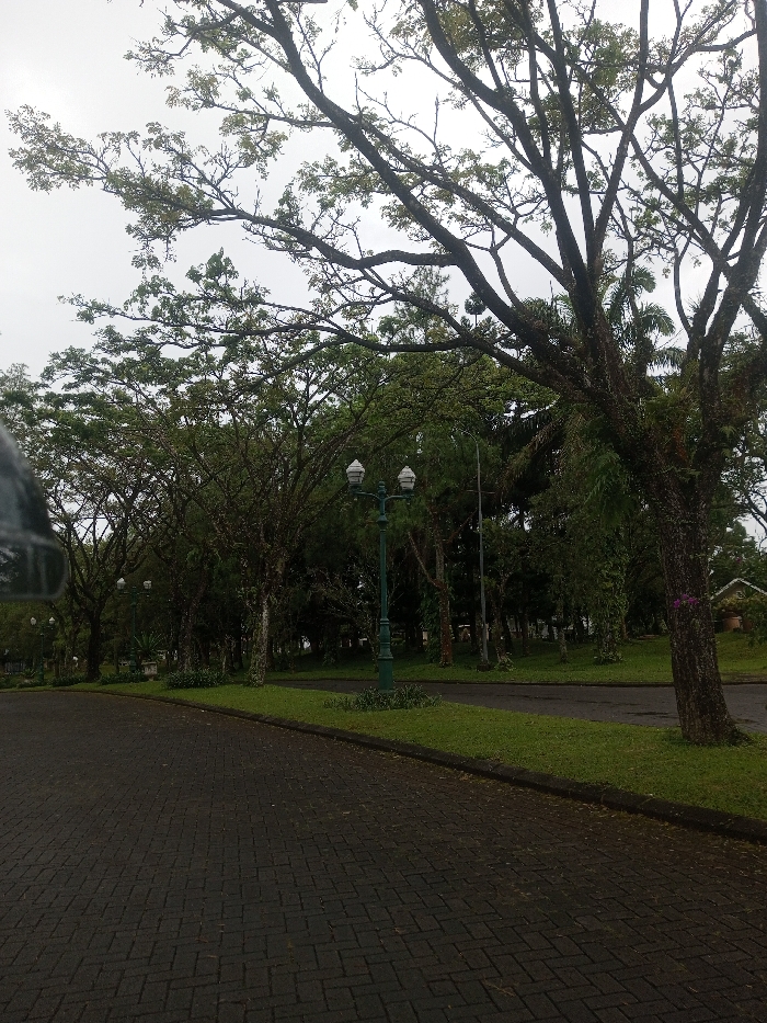 A tranquil park scene features a paved pathway with a brick pattern, bordered by a strip of green grass. Tall trees with dense foliage line the path, their branches creating a canopy overhead. A decorative green lamppost stands beside the road. The day appears overcast, casting a soft, muted light over the landscape. The scene evokes a sense of serenity and natural beauty.