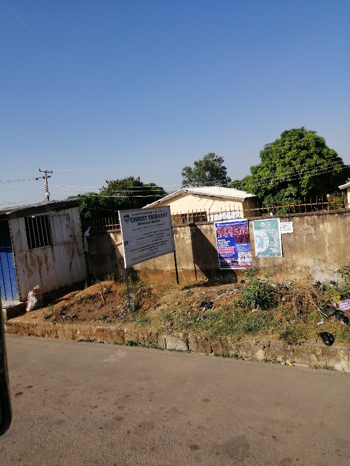 An outdoor scene captures a section of a paved road, an unpaved roadside, and a series of structures under a clear blue sky. The location is identified as Christ Embassy on Minango Road, in the city of Unknown, Unknown. In the foreground, a dark gray asphalt road, marked with various stains, occupies the lower portion of the frame. It is bordered by a concrete curb separating it from a raised, unpaved earth shoulder. This shoulder consists of reddish-brown soil mixed with patches of green grass, dry weeds, and scattered refuse, including white and black plastic bags and a black circular object. Mid-ground features a weathered concrete wall that runs horizontally across the scene. A metal fence with vertical bars is mounted on a section of this wall towards the right. Affixed to the wall are three posters: a blue and purple poster on the left, possibly advertising a "SOCIAL MEDIA CONFERENCE" for "SEPTEMBER 21-23"; a light blue and green poster in the center with a map-like graphic; and a partially obscured white poster on the right. To the left of the wall stands a small, single-story, dilapidated structure with a faded blue metal door and barred windows. Its exterior appears to be a mix of white and rust-colored panels, possibly corrugated metal. A white bag leans against its base. Above and behind this structure, a wooden utility pole with power lines is visible against the sky. A prominent white sign, angled towards the road, is planted on two metal poles in front of the concrete wall. Text on the sign reads: "LOVEWORLD INC. CHRIST EMBASSY", "MINANGO ROAD", "Service Time: 7:30AM & 9:30AM", "WEDNESDAY SERVICE: 5:00PM", "ADULT BIBLE STUDY: 7:00PM (MONDAY)", and "GLOBAL COMMUNION & HEALING SERVICE: SUNDAY 17TH DECEMBER 2023". Behind the wall and fence, a light-colored, single-story building with a white roof is visible. Further back and to the right, a large, dense green tree dominates the background vegetation, with other trees and shrubs also present. The upper half of the image is dominated by a clear, uninterrupted blue sky. No individuals are present in the scene.