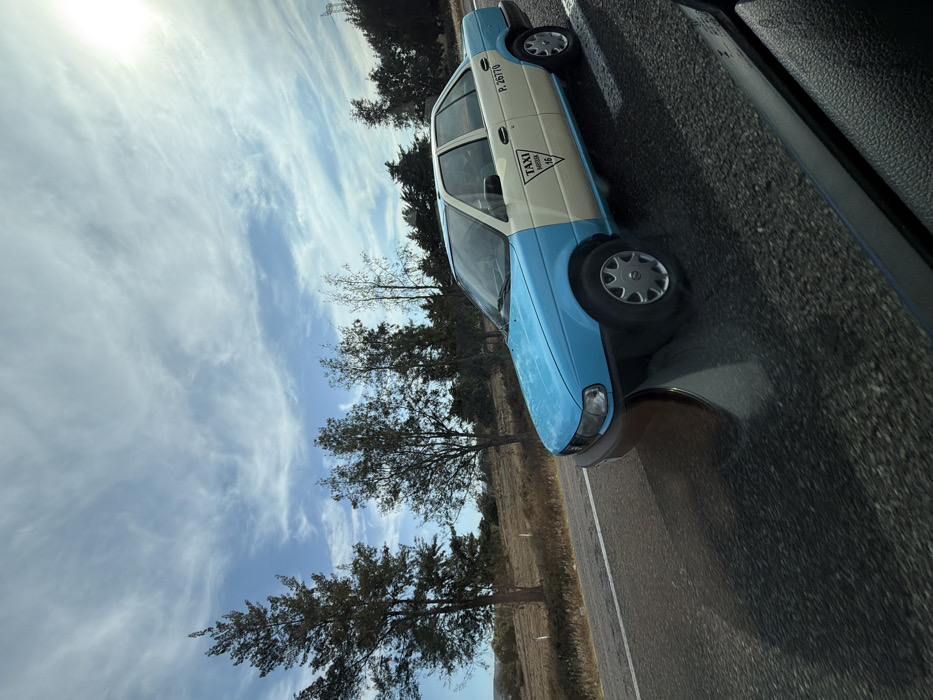 A light blue and white taxi travels on a road, beside trees and a field under a bright, cloudy sky. The car's body is split into two colors: light blue on the bottom and white on the top half. The front license plate is visible, but hard to read. The image is captured at an angle, showing the pavement of another vehicle’s interior.
