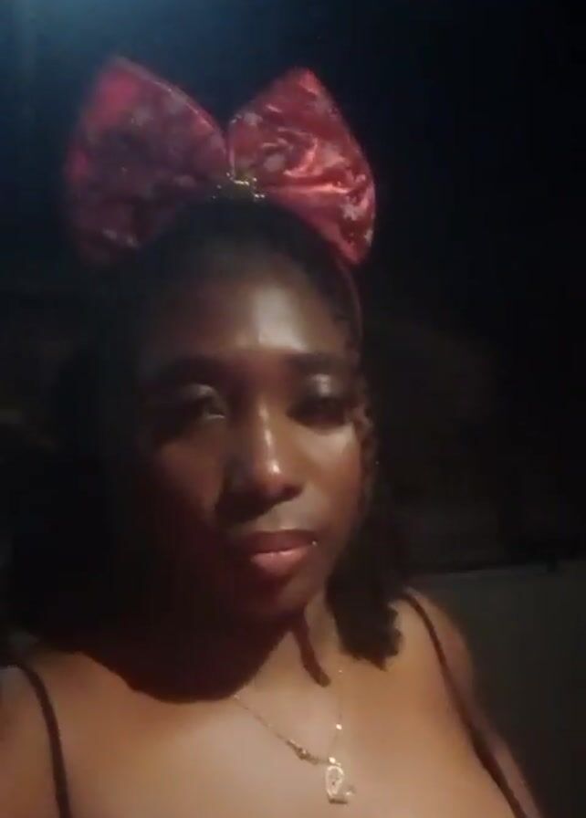 A person with dark skin is centered in the frame, wearing a red bow headband and a gold necklace with a pendant. The person looks directly at the camera with a neutral expression. The background is dark, possibly nighttime, with what appears to be a street light or other bright light source shining from above and behind the person. There is the sound of voices in the background.