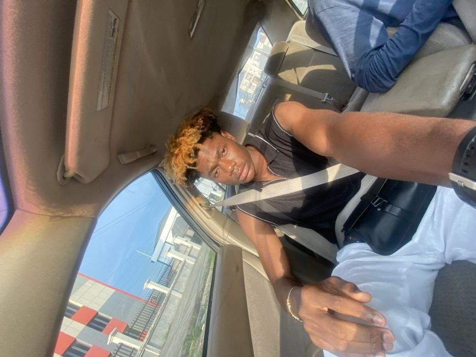 The image captures a selfie taken inside a car, situated in the city of Ilado, Nigeria, during daylight hours