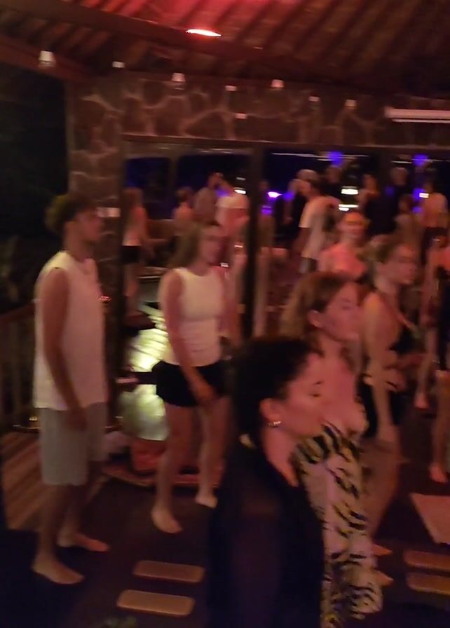 In a slightly blurry indoor setting, a group of about 20 people are gathered. Most stand on yoga mats spread across the dark floor, and some are barefoot. Their attire varies, from casual tank tops and shorts to swimwear. The room's ambiance is dim, lit by red and blue lights, and it features a wooden, hut-like ceiling. The surroundings seem to be a spa or recreational area. The individuals appear to be listening to something or someone, indicating a possible class or group activity.