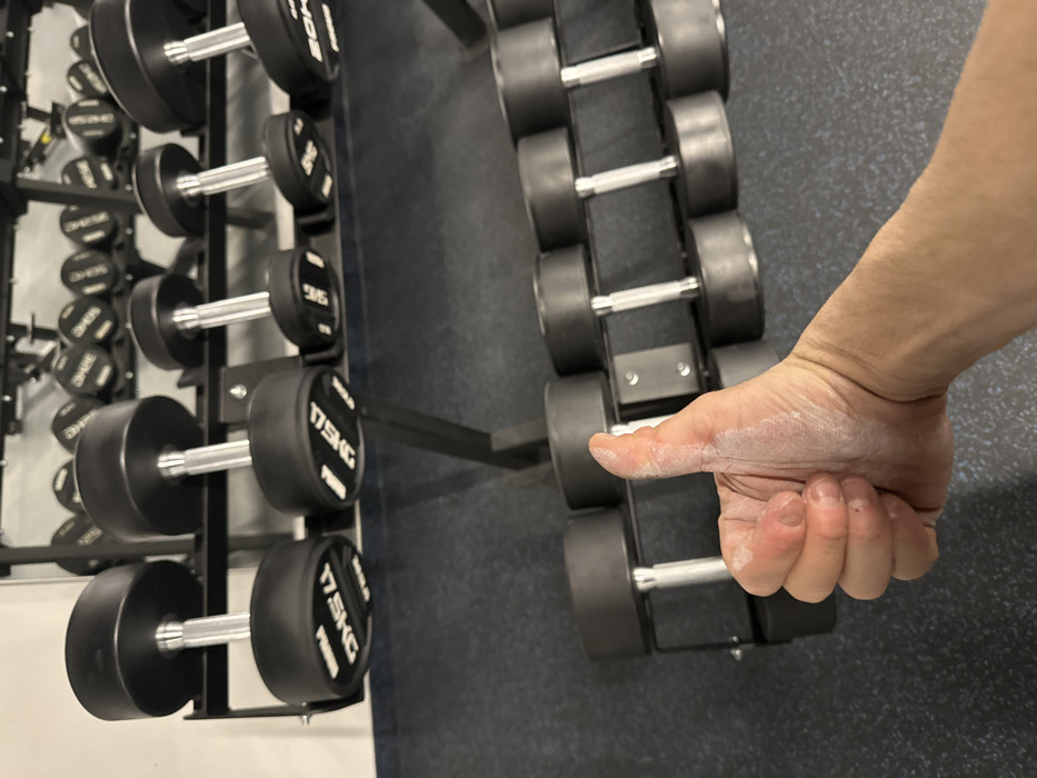 The image presents a close-up view of a human right arm and hand, covered in white chalk, executing a "thumbs-up" gesture in the lower right portion of the frame. The background depicts an indoor fitness gym setting with two multi-tiered black metal dumbbell racks. The upper rack holds numerous black, rubber-coated dumbbells with chrome handles. Visible weight markings include "17.5KG" and "9KG", with some dumbbells displaying "POWER" and "ROGUE" branding. A second, lower rack is also populated with similar black dumbbells. The floor consists of dark gray or black speckled rubber gym matting. A plain light-colored wall is partially visible in the upper left. The specific location within the city of Sofia, Bulgaria, is not identifiable from the visual content.