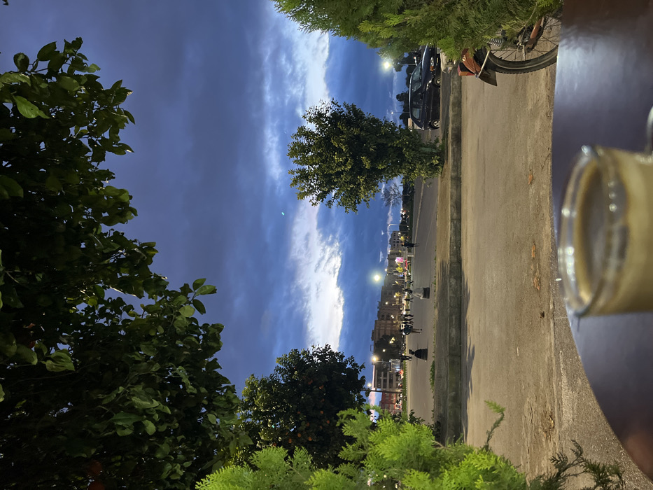 An outdoor scene captures the transition from dusk to night. A sliver of moon illuminates a cloudy sky above trees and a city street. The foreground features foliage, while a street runs alongside, hosting parked vehicles, people, and street lights. A blurred beverage sits in the corner, adding a casual foreground element to the urban landscape.