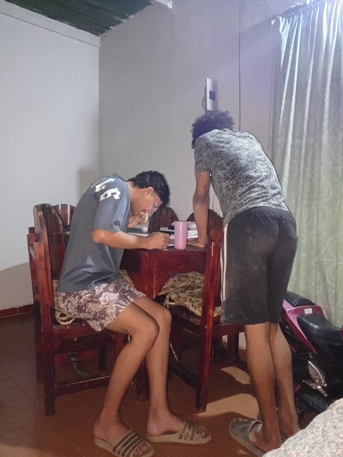 The image depicts an indoor scene in Altagracia, Venezuela, featuring two male individuals within what appears to be a residential space. **People:** 1. **Subject 1 (Left):** A male individual is seated at a dark-stained wooden table. He wears a blue short-sleeved t-shirt with white graphics on the upper back/shoulder and patterned shorts featuring a brown and tan leaf motif. His dark hair is styled short. He is bent forward over the table, actively consuming a light-colored pastry or bread-like item. His feet are visible, clad in striped slide sandals. 2. **Subject 2 (Right):** A second male individual stands partially obscured, leaning forward with his left arm resting on the table. He is viewed primarily from the back, displaying dark, curly hair. He wears a grey patterned short-sleeved t-shirt and dark shorts with vertical white stripes along the side seams. His feet are visible, wearing light-colored slide sandals. **Objects:** * **Table and Chairs:** A prominent dark-stained wooden table with carved legs occupies the center. Two matching wooden chairs are positioned at the table; one is occupied by Subject 1, and the other, partially obscured, is near Subject 2. The chairs feature slatted backs and cushioned seats, one with a light-colored, patterned fabric. * **Tabletop Items:** A pink plastic cup and what appear to be books or papers are visible on the table. * **Room Structure:** The room has light-colored walls, possibly white or off-white. In the upper left, a green ceiling or ceiling trim is visible. On the right wall, a white rectangular object, possibly an electrical device or decorative element, is mounted. A light-colored, possibly sheer, curtain hangs along the right side of the frame. * **Floor:** The floor is a uniform light brown or orange-toned surface. * **Other:** In the lower right corner, a portion of a pink and black motorcycle or scooter, including part of its seat and bodywork, is visible. **Actions and Interactions:** Subject 1 is engaged in eating while seated at the table. Subject 2 is standing adjacent to the table, leaning, suggesting observation or an impending interaction with Subject 1 or the table's contents. **Environment:** The scene is illuminated by artificial light, indicated by a slight glare on the right and the overall consistent lighting. The setting appears informal and domestic.