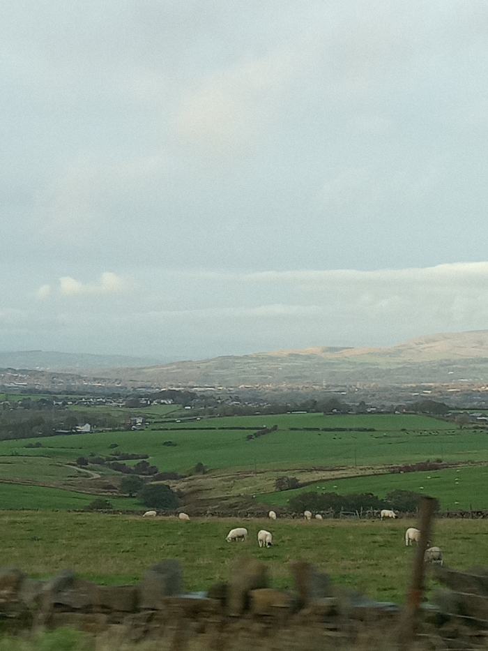 The image displays an elevated, panoramic landscape view within the Hyndburn borough, United Kingdom, under an overcast sky. A blurred dry stone wall occupies the immediate foreground. Beyond this, a vast green pasture extends across the midground, populated by approximately 12-15 white sheep. The sheep are scattered throughout the field, primarily grazing; some are facing left, others right, and some are partially obscured by terrain undulations. Field boundaries are delineated by darker green lines, likely hedges or fences. A winding dirt track is visible on the left side of the midground, descending into the pastureland. Sparse trees and bushes, exhibiting minimal foliage, are interspersed within the midground. In the far distance, a valley contains an urban settlement, consistent with a town within Hyndburn, characterized by numerous buildings, roads, and a prominent mast or tower. Beyond the settlement, undulating hills and moorland rise, extending to the horizon with muted tones of brown and dull green. The sky is uniformly light grey and densely overcast, providing diffused illumination across the entire scene. No human subjects or direct interactions are depicted.