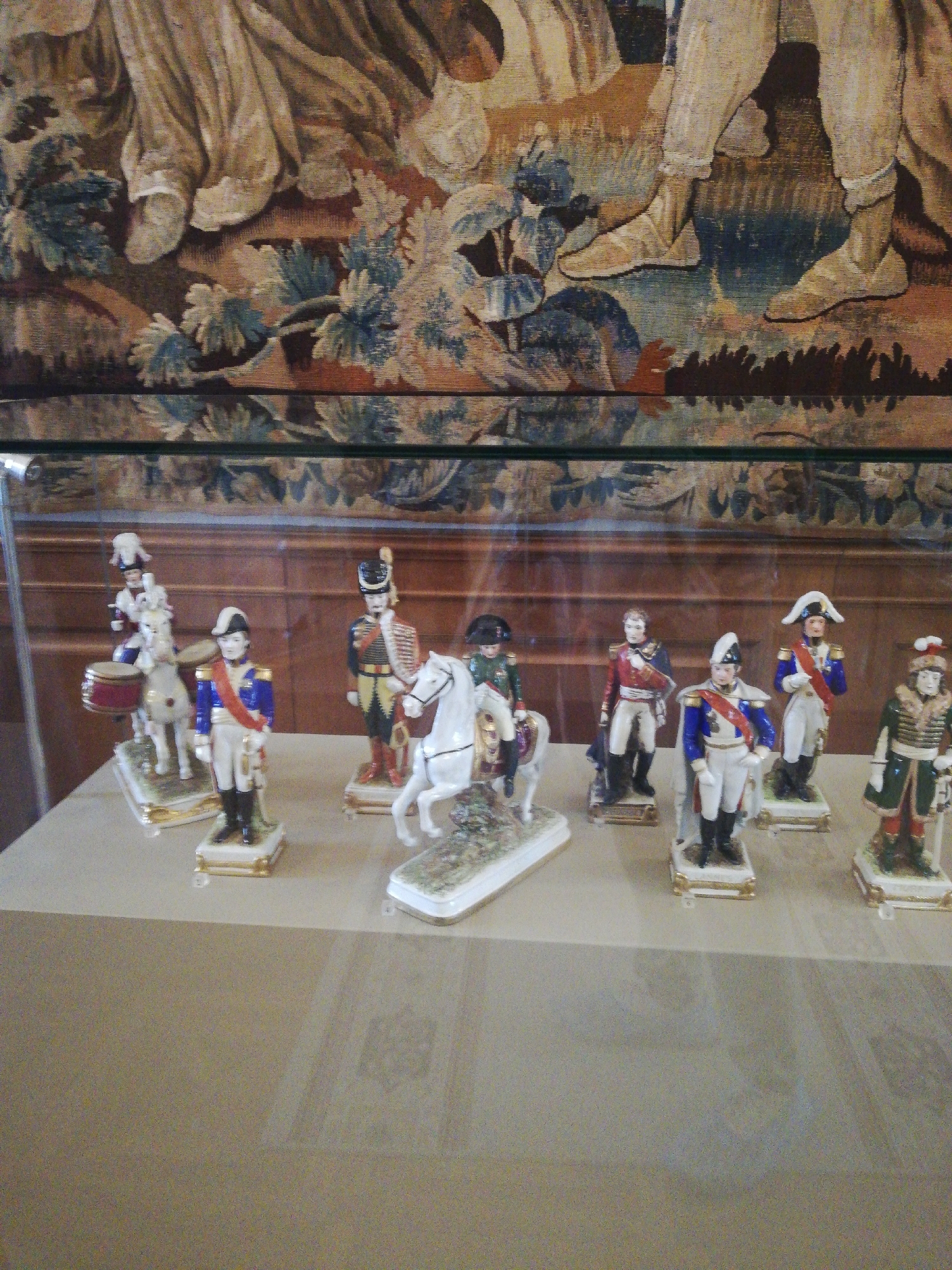 - "The image displays approximately ten porcelain military figurines, likely depicting Napoleonic-era soldiers and officers, arranged inside a glass display case" by FM-HgjJi1, licensed under CC BY 4.0