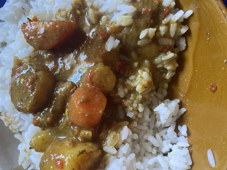 - "A close-up, overhead view displays a serving of white rice partially covered by a thick, yellowish-brown stew" by FM-YjXrN2, licensed under CC BY 4.0