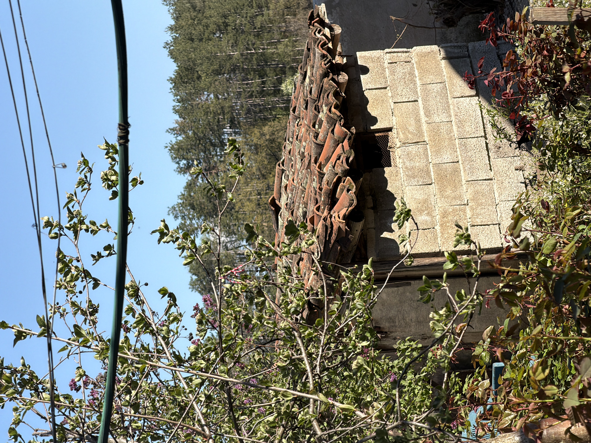 The scene is a close-up, slightly angled view of a building element, possibly an outbuilding, located in Radilovo, Bulgaria. The building has a terracotta tile roof with visible moss and age, and the walls are constructed of concrete blocks. A small barred opening or vent is visible in the wall. The background features a dense forest of tall, slender trees under a clear blue sky. In the foreground, branches and foliage from various plants obscure parts of the building. A thin green metal pole or cable runs vertically through the left side of the frame, and thinner electrical wires are also visible against the sky. The scene is well-lit, suggesting it is daytime.