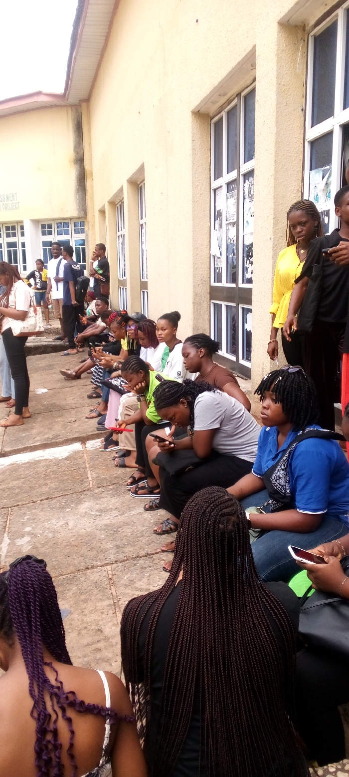 group of young people, primarily women, sitting on the ground outside a building, presumably a school or university