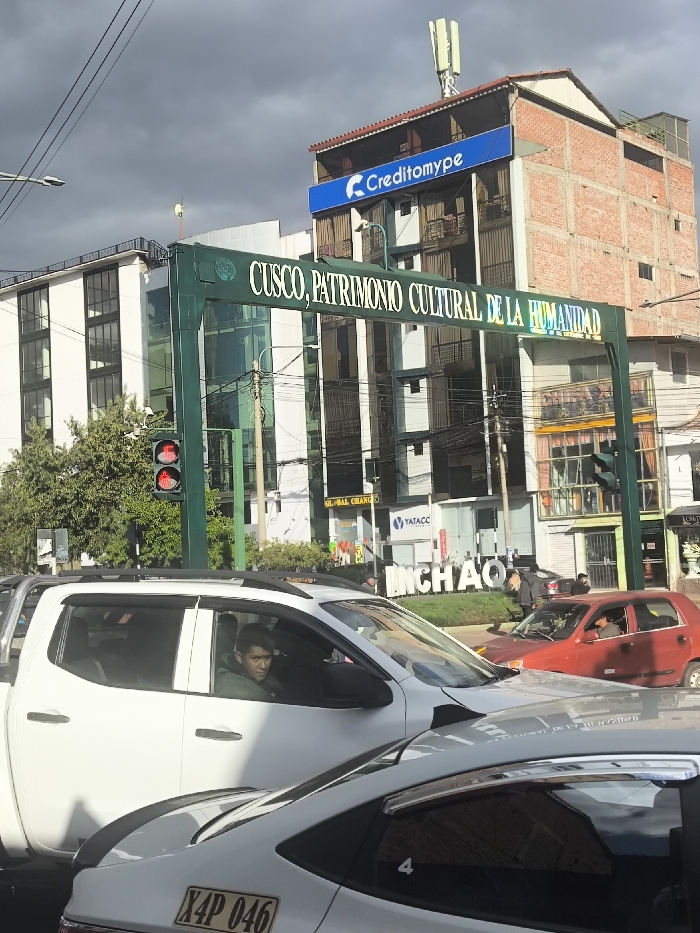 An urban street scene shows a green archway reading "CUSCO, PATRIMONIO CULTURAL DE LA HUMANIDAD"