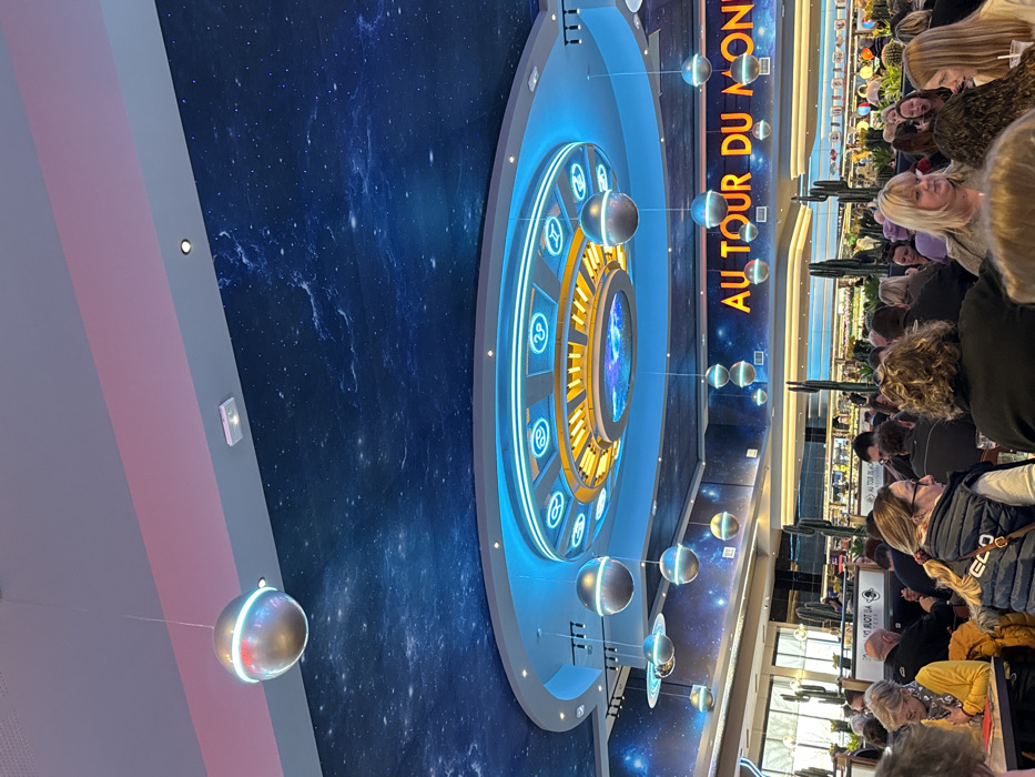 The image displays the interior of the "Au Tour du Monde" restaurant located in Mondeville, France. The scene is populated by approximately 30-50 patrons, primarily adults, seated at dining tables and engaged in social interaction and dining activities. The restaurant features a distinct celestial or space theme. The ceiling is predominantly dark blue with a pattern of stars and nebulae. A large, multi-tiered circular light fixture is centered on the ceiling, illuminated with concentric blue neon-like rings and inner yellow segments; some blue segments display symbols resembling zodiac signs. Numerous spherical pendant lights, designed to resemble planets, are suspended at various heights, some featuring glowing horizontal bands. One pendant light is distinctly shaped like Saturn with visible rings. Above the star-patterned ceiling, a lighter-toned upper ceiling section includes a recessed strip with pinkish-red accent lighting. A dark blue wall section in the background, mirroring the star pattern, displays the restaurant's name "AU TOUR DU MONDE" in orange-yellow lettering. Several tall, artificial green cactus plants are strategically placed between seating areas. In the background, a buffet-style food serving area with multiple food stations is visible. Tables are occupied; a woman in a yellow sweater and glasses sits at a table in the foreground left, and another woman wearing glasses and a dark blue quilted vest is prominent in the mid-foreground. Patrons are observed conversing.