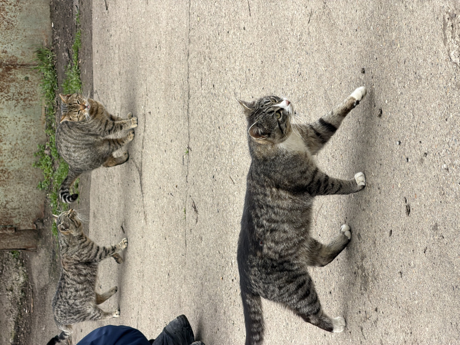 - "In the city of Beryozovy, Russia, an outdoor scene depicts four tabby cats on a light grey, cracked concrete surface" by FM-t12ef2, licensed under CC BY 4.0