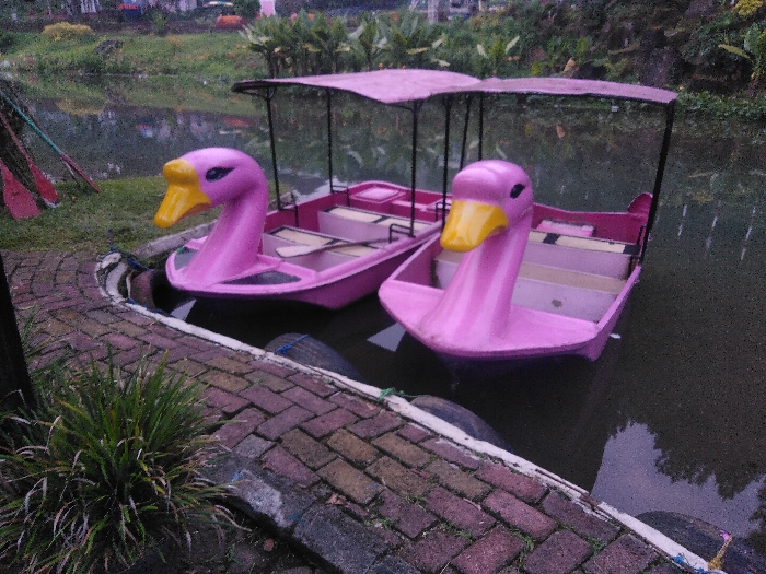 - "This image captures a recreational scene in Casa de Paja, Venezuela, depicting two unoccupied, pink duck-shaped pedal boats docked on a calm body of water" by FM-f4dh13, licensed under CC BY 4.0