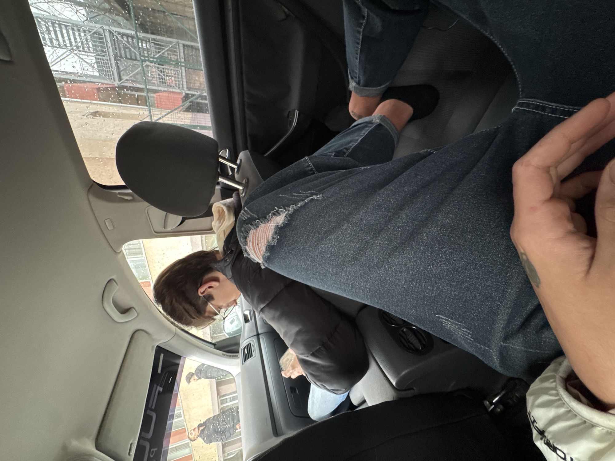 This image captures the interior of a vehicle, likely a Volkswagen, viewed from the rear passenger seat, set in an urban environment in Shumen, Bulgaria. The scene suggests overcast and rainy conditions, evidenced by water droplets on the car windows. In the front passenger seat, an individual with short brown hair and eyeglasses, wearing a black puffer jacket and light blue jeans with a torn left knee, is focused on a smartphone held in their hands. Their left leg is crossed. A grey headrest is visible behind them, with a light-colored cloth item positioned at its base. The vehicle's grey dashboard and center console with air vents are visible. In the immediate foreground, the perspective-taker's right hand, displaying a faint tattoo on the wrist area, and a section of their dark blue jeans are visible. A white garment is also partially discernible on the far left. Outside the vehicle, through the front windshield, two male individuals in dark, patterned jackets are standing on a street or pavement next to a light-colored building. Through the passenger-side window, a multi-story building with an exterior metal fire escape or staircase, incorporating red structural elements, is visible against the background.