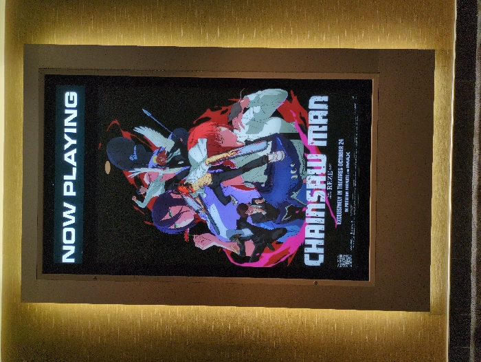 A framed digital poster advertises "Chainsaw Man". The poster features colorful, dynamic artwork of characters in action. Text to the left displays "NOW PLAYING" vertically. To the right, the title "CHAINSAW MAN" is written vertically. Below the title it states "EXCLUSIVELY IN THEATRES OCTOBER 24" and "in premium formats, including IMAX." A QR code is located in the lower right corner. The frame is lit from behind creating a warm, inviting glow.