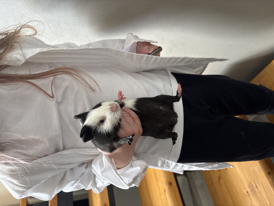 The scene is depicted indoors in Votkinsk, Russia. A bicolored guinea pig, primarily black with a distinct white face covering its forehead, nose, and chin, is held vertically by a person. The guinea pig exhibits black eyes and a pink nose, with its pink paws visible. The person, largely obscured from the chest down, is wearing a white long-sleeved top over dark trousers. Long, light reddish-brown hair is visible extending over the person's right shoulder and chest. The person's hands support the animal's upper and lower body. In the background to the left, a section of a wooden staircase or stepped structure with light-colored treads and dark risers is visible. The background to the right consists of a plain, light-colored wall. The environment is uniformly lit.