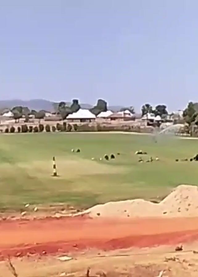 wide shot of a large grassy field, likely a golf course or a similar recreational area. The field is green and well-maintained, with several sprinklers actively watering the grass. Scattered across the field are small, indistinct figures, which could be people or objects. In the background, a row of houses or buildings is visible, with a distant mountain range on the horizon under a clear sky. In the foreground, there's a dirt or reddish soil area with a mound of sand. A metal tower is partially visible on the right side of the frame. There's also a construction or maintenance site visible, with various pieces of equipment present.