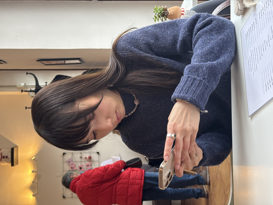 Inside a cafe or restaurant in Subotica, Serbia, a female individual, appearing to be an adult, is seated at a white table in the foreground. She has long dark brown hair with bangs and is wearing a dark blue knit sweater. Her head is angled downward, focusing on a gold-colored smartphone with a clear case that she holds in both hands, actively engaging with the device. She wears a multi-strand beaded necklace, a silver-colored ring with a dark stone on her right index finger, a thin gold-colored ring on her right ring finger, and a silver-colored chain bracelet on her right wrist. On the white table to her right is a paper menu or document displaying multiple lines of text. In the background, to the left of the frame, an adult male with grey hair, wearing a bright red quilted jacket, blue jeans, and brown shoes, stands with his back partially to the viewer, looking down at papers held in his hands. The interior environment includes light-colored walls, several wall-mounted light fixtures emitting warm yellow illumination, and a white grid-style display board adorned with various small items, including a red spherical ornament. A white object resembling a snowman decoration is visible on a shelf above the display board. To the right, a dark, multi-hook coat rack and a framed object are mounted on a light-colored wall, adjacent to a window providing ambient light. A small potted succulent plant is visible on the table's far right. The floor appears to be a light brown or tan material.