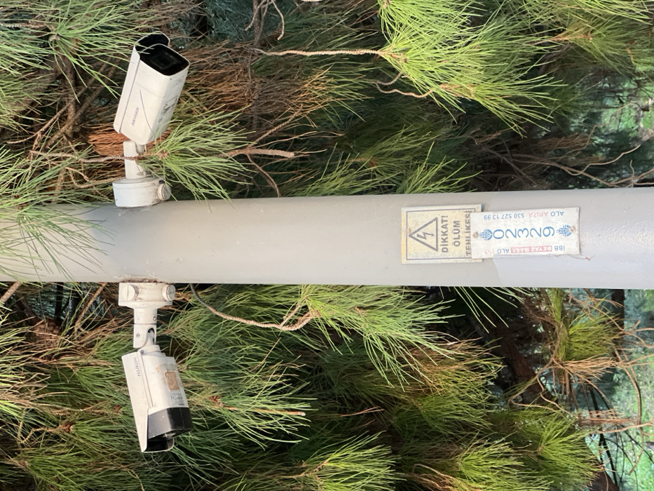 Two Hikvision security cameras are mounted on a gray pipe amidst green pine needles. A weathered warning sign is affixed to the pipe, displaying a lightning bolt symbol, and the text "DIKKAT! OLUM TEHLIKESI" (Warning! Danger of Death) in Turkish. Next to it, another sign shows a contact number for reporting issues. The pipe and cameras are integrated into the environment, partially hidden by the surrounding greenery.