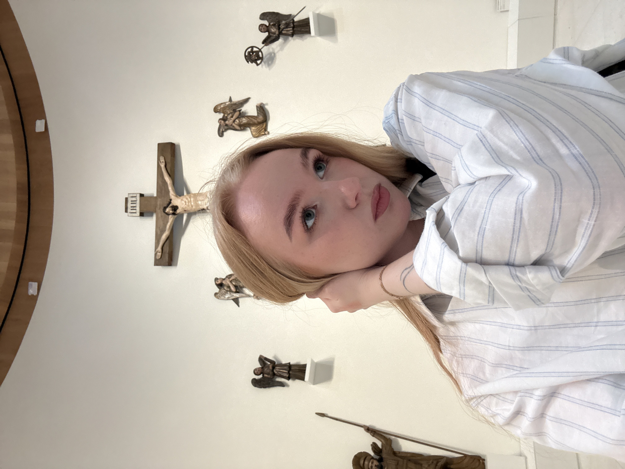 A young woman is photographed indoors, with a wall displaying religious iconography in the background. The iconography includes a crucifix and several statues of angels and saints. The woman has blonde hair, fair skin, and blue eyes. She wears a white and blue striped shirt. Her left hand supports her cheek. The location is likely the Perm State Art Gallery, located in the city of Perm, Russia.