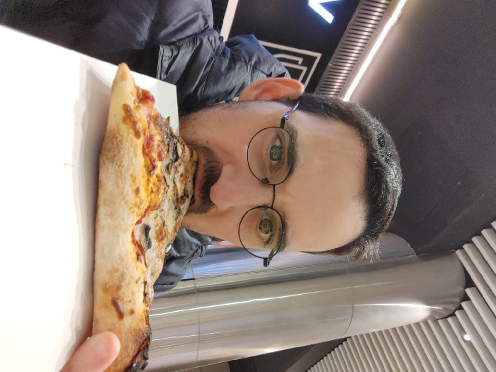 - "A man wearing round spectacles eats a slice of pizza" by FM-3Ip2o1, licensed under CC BY 4.0