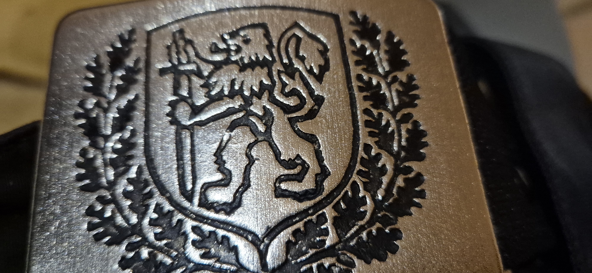 This image depicts a close-up, angled view of a metallic object, likely a belt buckle or similar accessory, located in the city of Unknown, Unknown. The object exhibits a brushed or textured silver-tone finish. Its central feature is an engraved or enameled crest. The crest contains a dark, stylized depiction of a quadruped animal, possibly a lion or griffin, rampant on the left, facing right. Adjacent to this animal on the right is another dark, stylized figure, potentially human or animal, in a crouching or lunging posture. The upper and lower areas within the crest outline feature dark, stylized foliage or branch motifs. A dark horizontal bar is visible below the central figures. The background is blurred, showing dark, indistinct shapes above and to the right, and a blurred light brown surface to the lower left. No people or specific actions are visible.