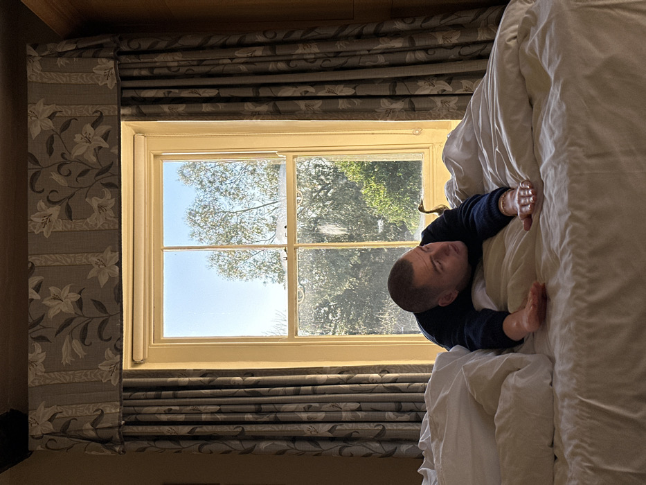 An individual lies prone on a white-sheeted bed within an indoor room located in North Norfolk, United Kingdom. The adult male, with short hair and wearing a dark blue long-sleeved top, rests with his forearms extended on the bed, gazing rightwards towards a large, cream-colored wooden sash window. A gold-colored bracelet is visible on his right wrist. The window, divided into four panes, features patterned curtains with white lily motifs on a grey ground, topped by a matching valance. Through the window, a bright blue sky and distant trees with sparse foliage, along with green undergrowth, are visible under clear daylight. A small, brass-colored ornament rests on the windowsill.