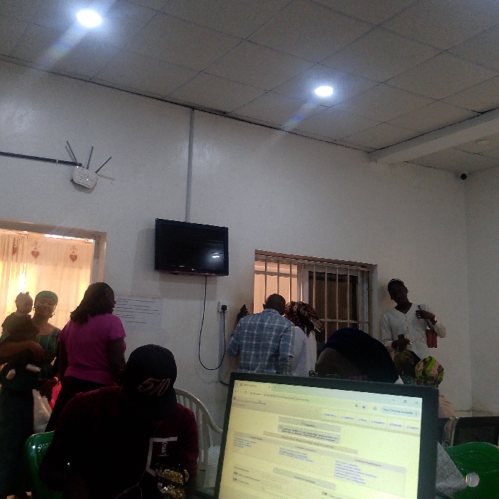 This image depicts an indoor scene in Lokoja, Nigeria, characterized by a brightly lit room with white walls and a white suspended ceiling featuring square panels and two circular recessed LED lights