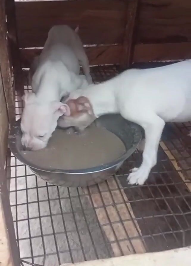 - "Two white puppies are drinking from a silver bowl inside a wooden and wire cage" by FM-aKj7t1, licensed under CC BY 4.0