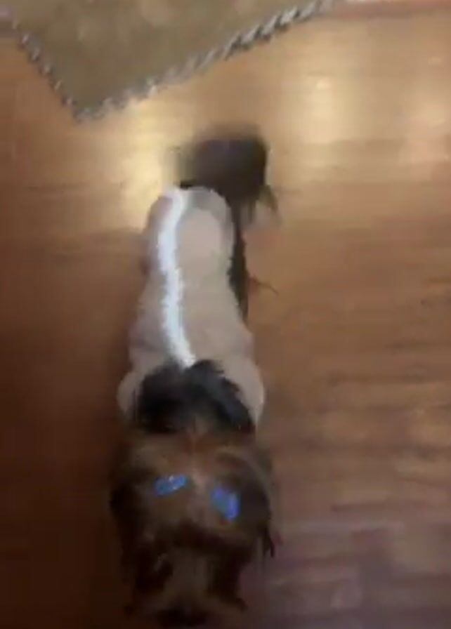 A small, brown-and-black Yorkshire Terrier with blue barrettes in its hair and a beige sweater is standing on a wood floor. It begins to whine. It has a short haircut. Its tail wags. It seems to be looking at the person holding the camera. There is a rug visible in the background.