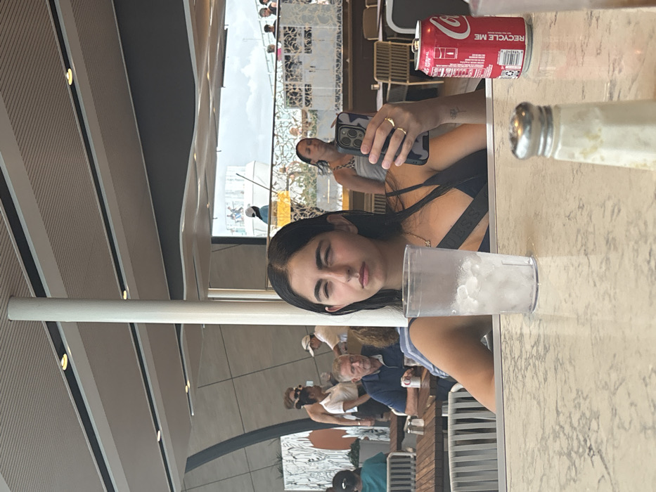 The image depicts a contemporary dining or bar area, located in the city of Falmouth, Jamaica, offering a view of a port. In the immediate foreground, a young adult female with dark hair, wearing a dark-colored top, is seated, looking towards the left with her eyes partially closed. Her left hand holds a smartphone with a camouflage-patterned case; a gold ring is visible on her left ring finger, and a small tattoo is present on her left forearm. On the light-colored, patterned countertop in front of her are a clear plastic cup filled with ice and liquid, a red Coca-Cola can, and a silver-topped shaker. In the mid-ground, behind the primary subject, another female is seated or standing, looking left. Further back, an older male with gray hair, wearing a blue polo shirt, is seated at a table with a white beverage can. Other individuals, including one possibly identified as staff in a white shirt and another bare-chested male with sunglasses, are observed standing or moving. The area features modern architecture, including a prominent white structural column, light-colored tables and chairs, and a segmented ceiling with integrated lighting. A wall with a black and white mural is visible on the far left. The background reveals an expansive outdoor view through a large opening. A significant white cruise ship is docked or underway in the distance, with visible figures on its upper deck. The sky is overcast. A decorative metal railing separates the foreground interior from the distant outdoor scene.