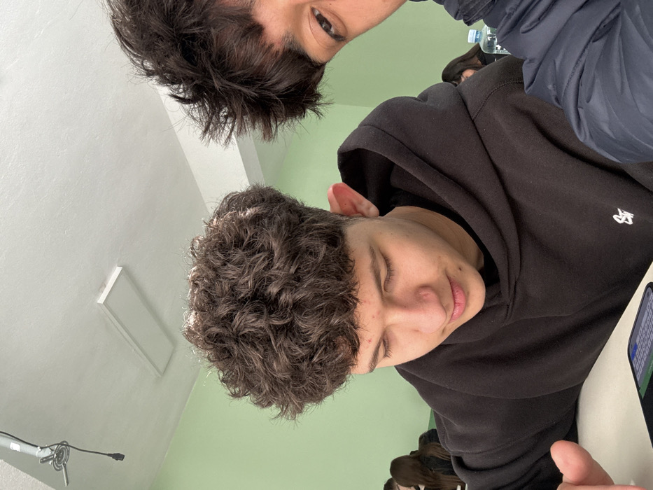 The scene depicts an indoor academic environment, specifically a classroom or lecture hall, located in Unknown, Unknown. In the foreground, a young male with dark, curly hair and a black hoodie is seated at a white desk, looking down at a smartphone screen displaying what appears to be a calculator or keypad. To his right, another young male's face is partially visible, showing his right eye, eyebrow, and dark, spiky hair, indicating he is likely taking the photograph. In the background, several other individuals, presumably students, are seated at desks. The environment features light green walls and a white ceiling with a rectangular overhead light fixture and an exposed electrical wire with a mounting bracket in the upper left corner. A partially visible plastic water bottle rests on a desk in the mid-right background.