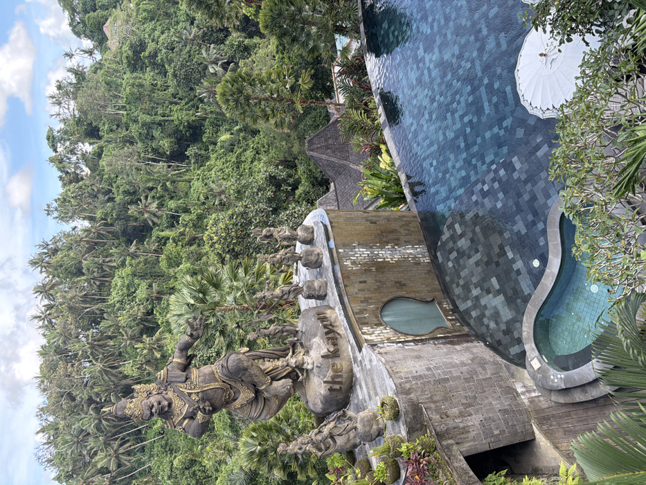 A lush tropical landscape frames a statue of a deity atop a stone structure with "the kayon" inscribed. Nearby is a turquoise-tiled pool, partially shaded by a white umbrella. The scene is captured from an elevated perspective, showcasing a blend of nature and architectural design.