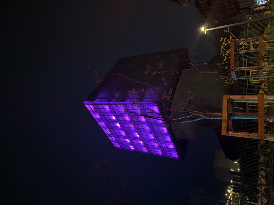 A cubic building, illuminated with a purple grid-like pattern, dominates the dark sky. Bare branches of a tree intersect the view, juxtaposed against the building's stark geometry. To the right, a wooden structure, possibly a fence or trellis, is visible, framing sparse vegetation. Distant lights flicker in the background, suggesting an urban setting. The scene is captured at night, with the illuminated cube casting a surreal glow.