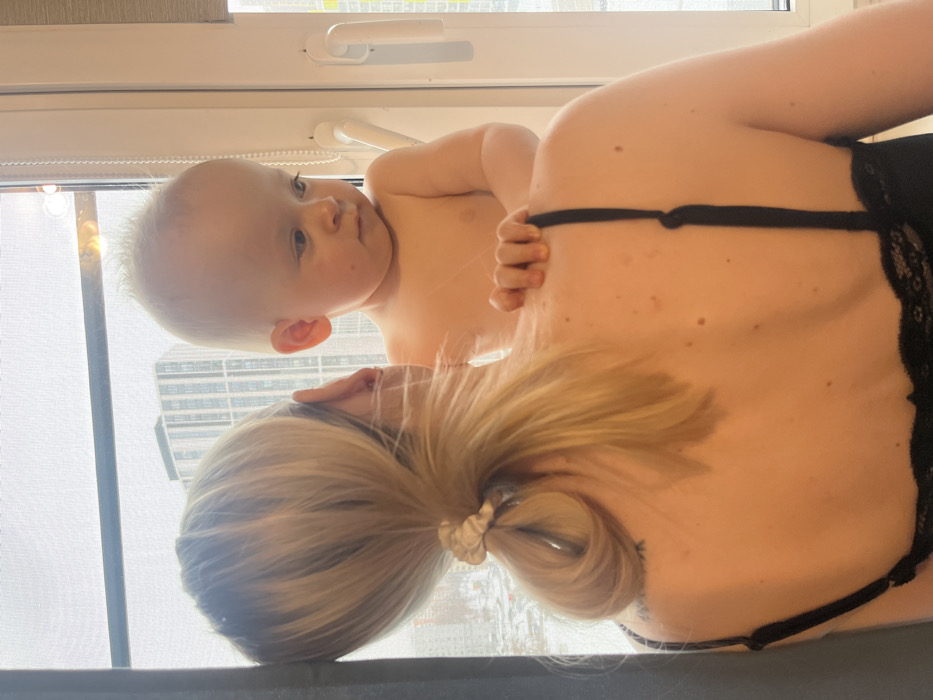 An indoor scene depicts two individuals near a large window in an urban setting in Khimki, Russia. An adult female is seen from behind, her blonde hair secured in a low ponytail with a light-colored scrunchie. She wears a black top with lace trim and thin straps, revealing fair skin and multiple moles on her back and left shoulder. She appears to be leaning against a dark window frame or wall on the left. An infant, light-skinned and shirtless, is positioned in front of the adult. The infant's right hand rests on the adult's left shoulder. The infant has light hair and a neutral expression, looking towards the right side of the frame. Through the bright window, an urban environment is visible under diffuse natural light. Several high-rise buildings, including a prominent light-colored tower with multiple windows, are discernible in the background, confirming the location as Khimki, Russia. A white window frame is visible on the right, along with a partial view of a light-colored window blind or screen at the top.