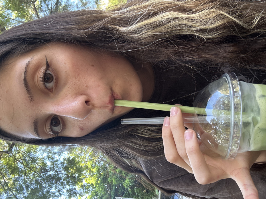 The image depicts a close-up, chest-up view of a female subject outdoors in Tel Aviv, Israel. She has long, dark brown hair with lighter highlights and a light complexion, exhibiting prominent pores and minor blemishes on her face. Her brown eyes are open, and she wears dark eyeliner. She is dressed in a dark-colored top and a necklace with a small, dark pendant. The subject is actively drinking from a clear plastic cup containing a foamy, light green beverage with ice, using a light green straw. A second, clear straw is also inserted into the cup, which features a clear domed lid. Her right hand is visible, gripping the cup. The background is out of focus, showing green foliage and patches of blue sky, consistent with an outdoor environment such as a park or an open-air cafe.