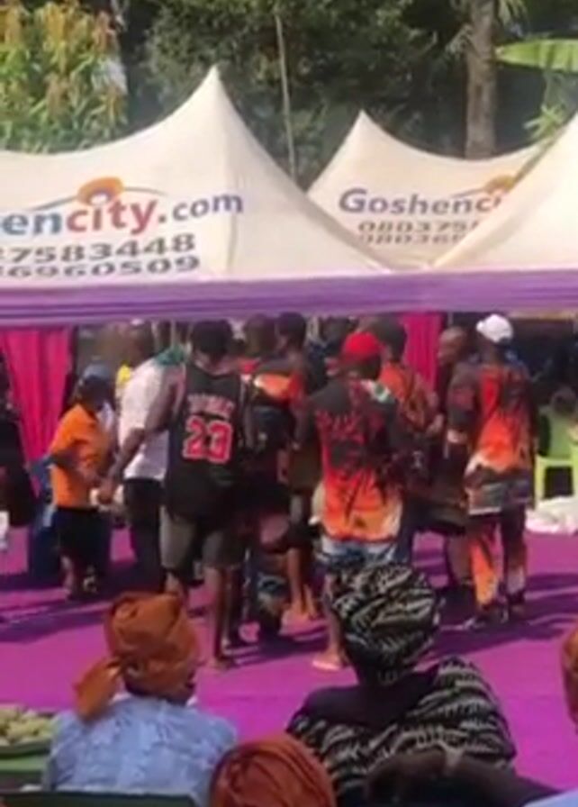 group of people dancing and playing music outdoors on a purple-covered platform. The musicians appear to be playing traditional drums. Some of the dancers are wearing brightly colored shirts. The audience is seated and watching the performance. There are white tents with the word "Goshencity.com" printed on them. The environment appears to be a gathering or celebration. The camera is at eye-level and slightly unsteady.
