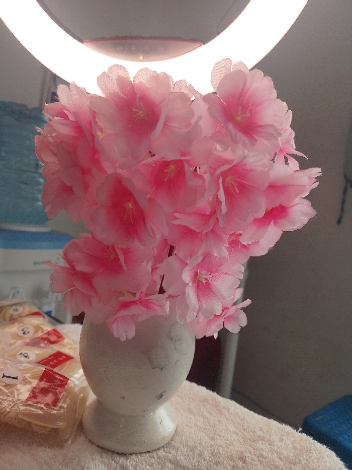 The scene is an indoor setting in Limuru Central ward, Kenya. A white, distressed, spherical vase with a pedestal base stands centrally, holding a dense arrangement of artificial pink fabric flowers. The flowers display lighter pink petals with darker pink centers and visible yellow stamens. The vase is positioned on a light-colored, textured fabric surface. To the left of the vase, multiple clear plastic bags containing light-colored artificial nail tips are present, each marked with red and white stickers featuring Chinese characters and numerical labels (e.g., "1", "2", "3"). An illuminated white ring light is partially visible in the upper background. The left background contains blurred light blue and white objects, while the right background is dark and out of focus. No individuals or actions are depicted.