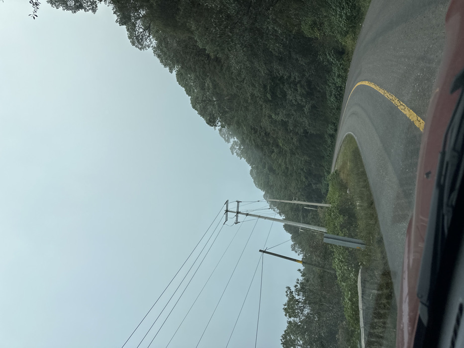 A winding road with a yellow line on its edge is visible from a car's perspective. Dense green trees flank the road, obscuring the view. Power lines stretch across the hazy sky. The weather appears misty or overcast. The road curves sharply, suggesting a mountain or hill terrain. The scene conveys a sense of travel through a natural, somewhat isolated environment.