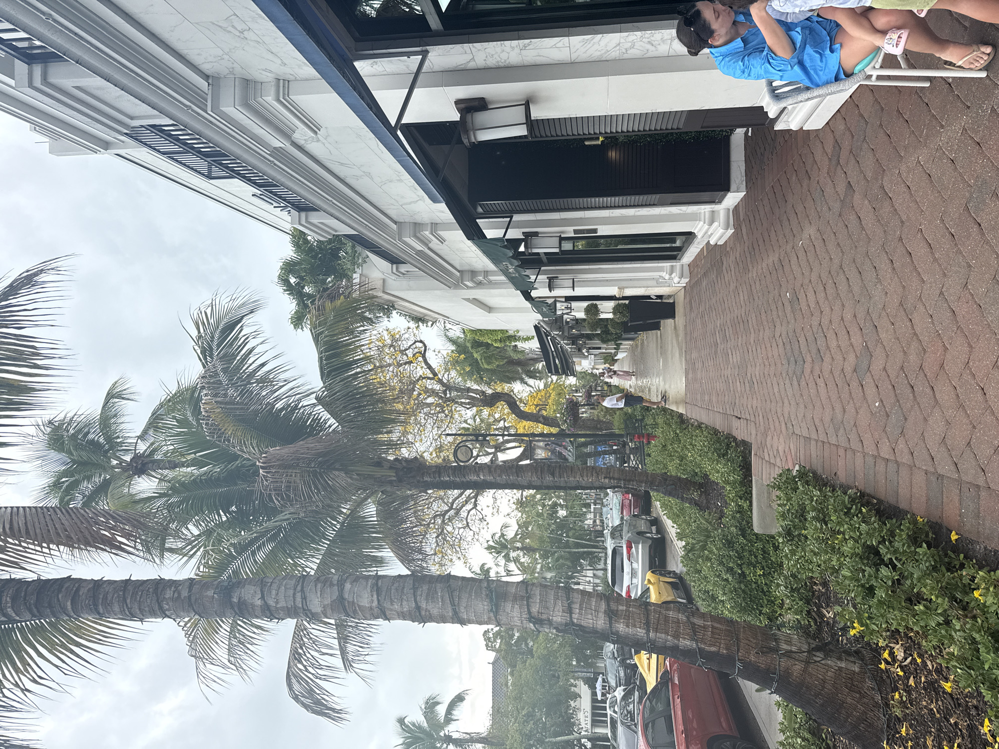 commercial scene in Naples, Florida, United States of America. The photograph is taken on a brick-paved sidewalk lined with tropical landscaping featuring palm trees. Cars are parked along the street to the right of the sidewalk. Along the left, a multi-story building with white facade and dark awnings stretches into the distance. A person sits in a chair outside a storefront. Pedestrians can be seen walking further down the sidewalk. The sky is overcast.