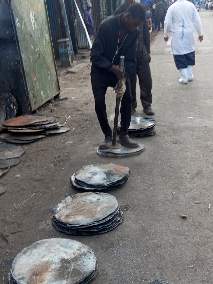 An outdoor scene depicts a manual metalworking operation within an urban environment, likely an informal industrial or market area in Nairobi, Kenya, consistent with locations such as Gikomba Market or the Industrial Area