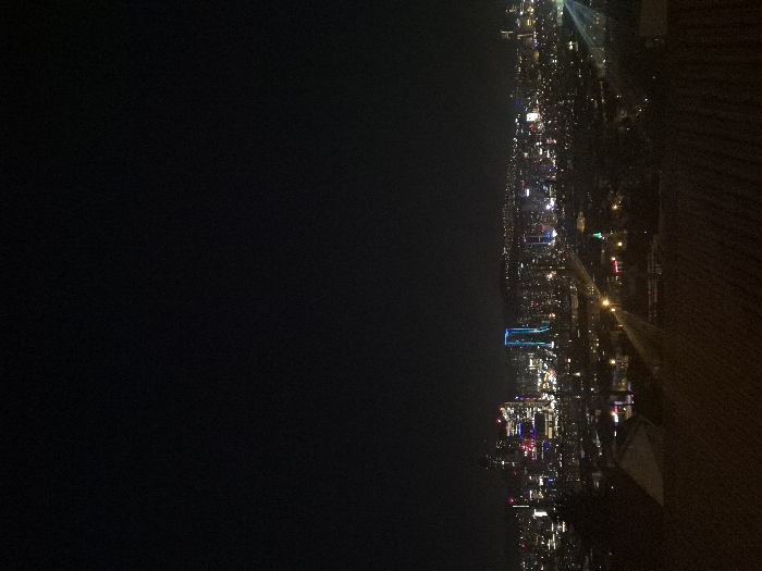 The image presents a nighttime panoramic view of a dense urban cityscape, observed from an elevated vantage point within Üsküdar, Turkey. The upper two-thirds of the frame consist of a uniformly black sky, indicative of deep night. The lower third features the sprawling city. In the immediate foreground, a dark, indistinct area, possibly a rooftop or elevated terrain, occupies the bottom 10% of the frame, with a faint, light-colored building outline visible on the lower-left. The midground shows scattered streetlights and smaller illuminated structures, with pronounced light rays emanating from certain sources due to lens flare. The background reveals a brightly lit urban core. To the left-center, a cluster of modern skyscrapers exhibits various colored illuminations, including red, purple, and white. Dominating the central skyline is a tall, slender telecommunication tower prominently illuminated in shades of blue and green, identifiable as the Çamlıca Tower. The city lights extend horizontally across the frame and diminish into the distant horizon. No individuals, specific actions, or interactions are discernible.