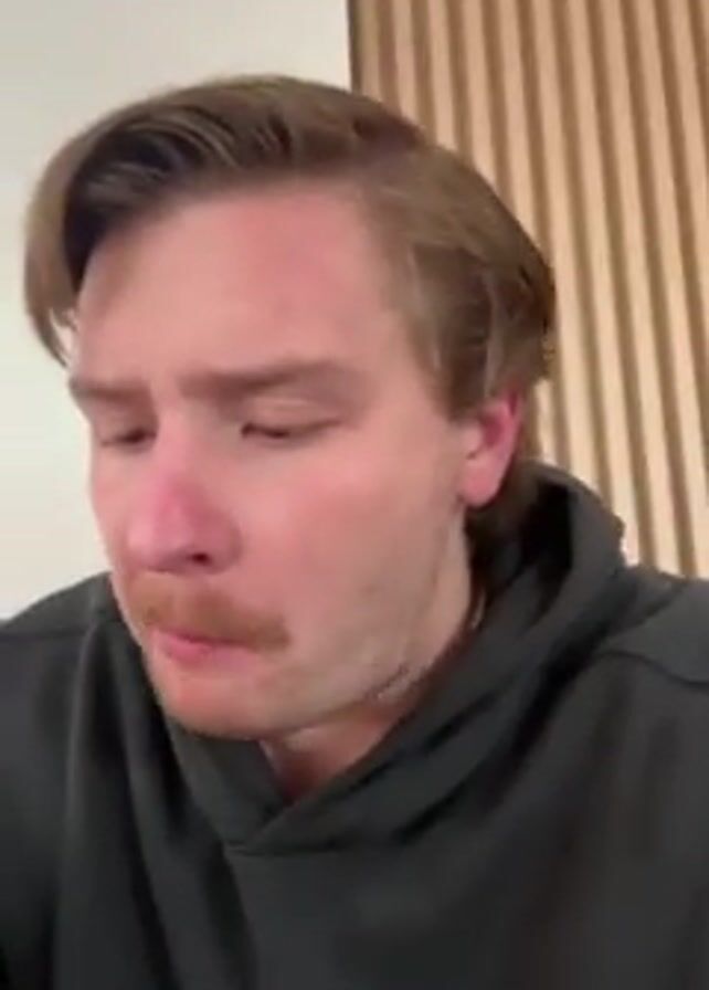 A man with reddish skin and a mustache eats something small and yellow in front of a wooden paneled wall and a light fixture. He wears a green hoodie and looks down while chewing. The background includes a wall with vertical wooden panels and a white device with a blue light emanating from underneath it.